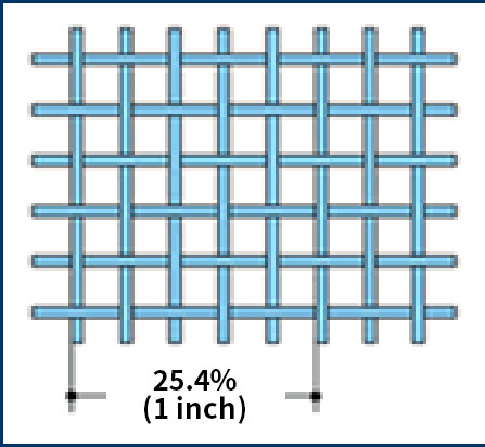 Тип сетки из нержавеющей стали маркируется сеткой.и относится к количеству сеток в ряд между 1 дюймом для простого ткачества. Чем больше количество сеток, тем тонче сетка. Обратите внимание, однако, что площадь открытия варьируется в зависимости от диаметра провода даже для одной сетки.На правом рисунке показан 5-мешевый экран с 5 сетками в ряд между 1 дюйм.